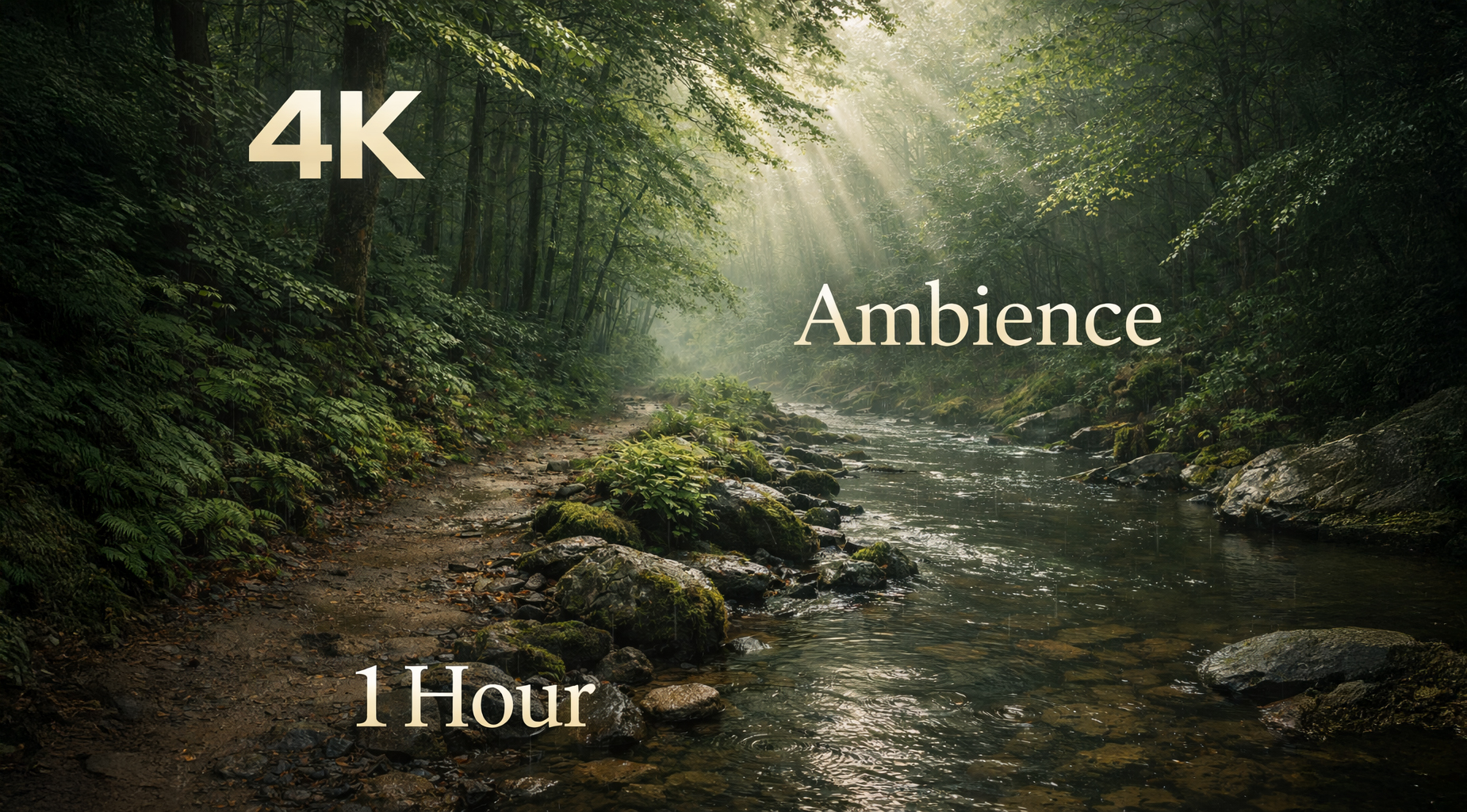 This relaxing ambience video features rainy forest sounds, river ambience, nature rain sounds, relaxing sleep sounds, and peaceful forest atmosphere in ultra HD 4K quality.