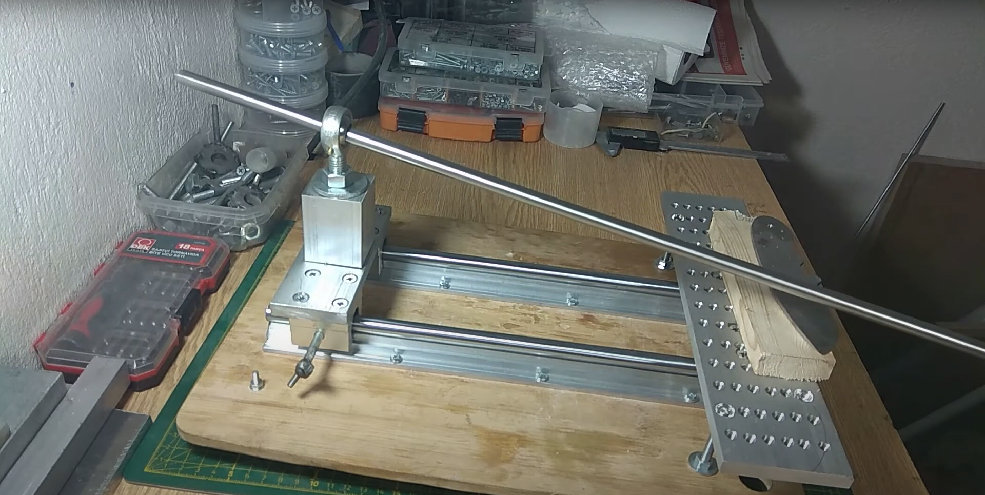 DIY builders often fabricate the machine frame using steel profiles, aluminum plates, or 3D printed components depending on workshop resources. Adjustable threaded rods are used to fine tune the bevel angle based on blade thickness and desired cutting geometry.