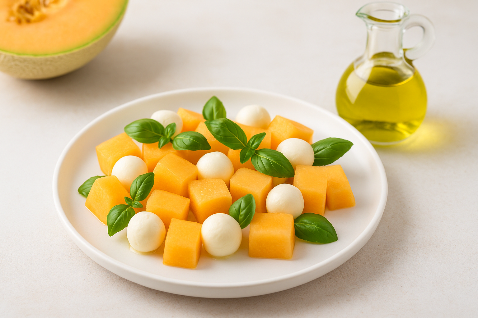 Yazın sıcağında hem ferahlatıcı hem de şık bir tabak arıyorsanız, bu tarif tam size göre! Kavunun tatlı aromasıyla taptaze fesleğen ve tuzlu mozzarella bir araya geliyor — hem hafif hem de doyurucu bir yaz salatası!